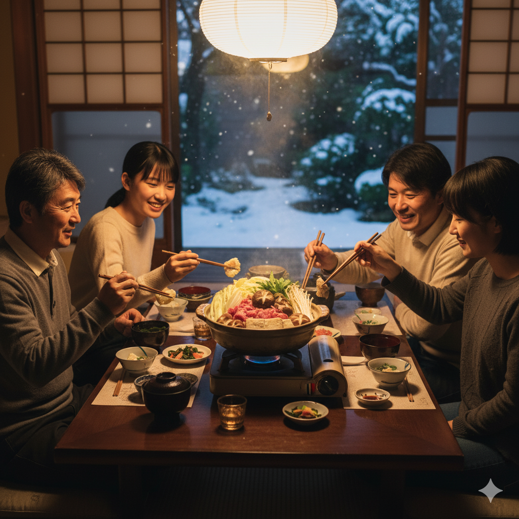 O Prato: O Ramen (macarrão em caldo longo e saboroso, com carne de porco e ovo cozido) é extremamente popular em todo o Japão e, embora seja uma comida de rua, a preparação do caldo em casa pode se estender por horas, tornando-o um prato de fim de semana. No inverno, o Nabe (hot pot japonês) assume o protagonismo, cozido lentamente à mesa e compartilhado por todos.