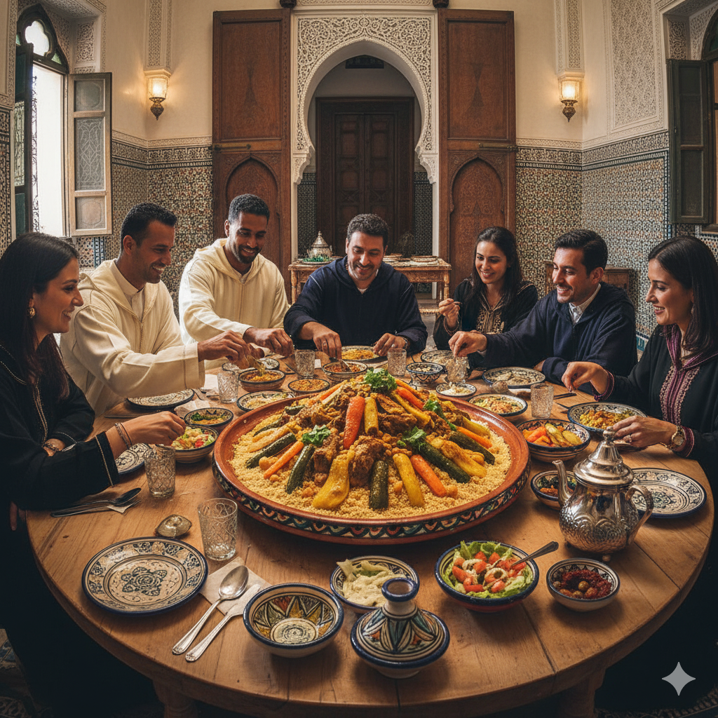 No Marrocos, e em grande parte do Magrebe, o Cuscuz é tradicionalmente o prato da sexta-feira (dia sagrado muçulmano), mas é também uma refeição festiva e de convívio para o domingo, servido em grandes travessas compartilhadas.