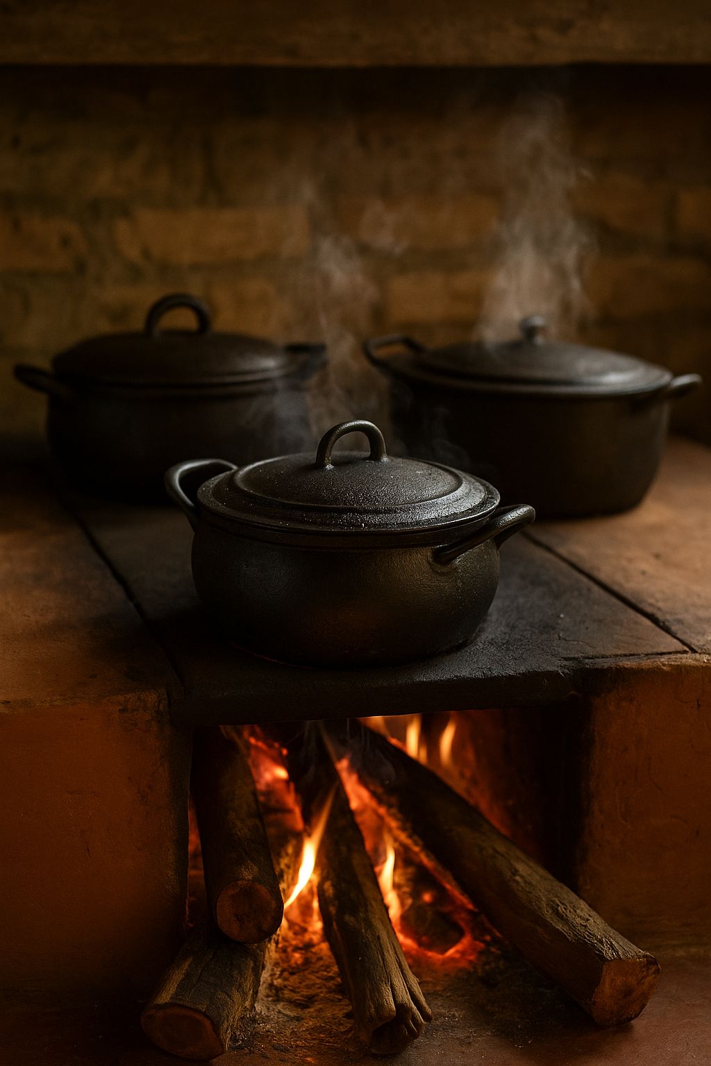 O fogão a lenha atua como o alicerce da culinária afetiva, onde o calor constante da brasa apura os sabores e o tempo parece desacelerar enquanto o perfume da lenha queimada preenche o ambiente (IA)