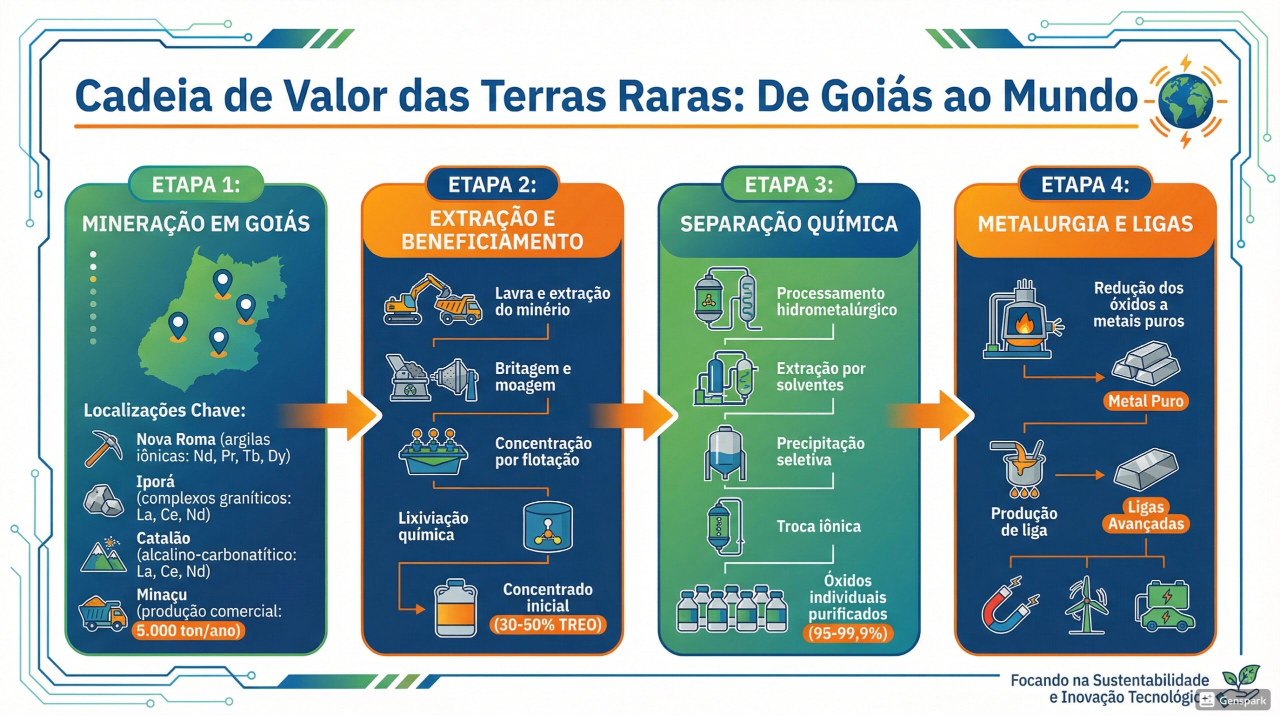 O infográfico acima ilustra a jornada completa das terras raras desde os depósitos minerais em Goiás até os produtos tecnológicos finais.